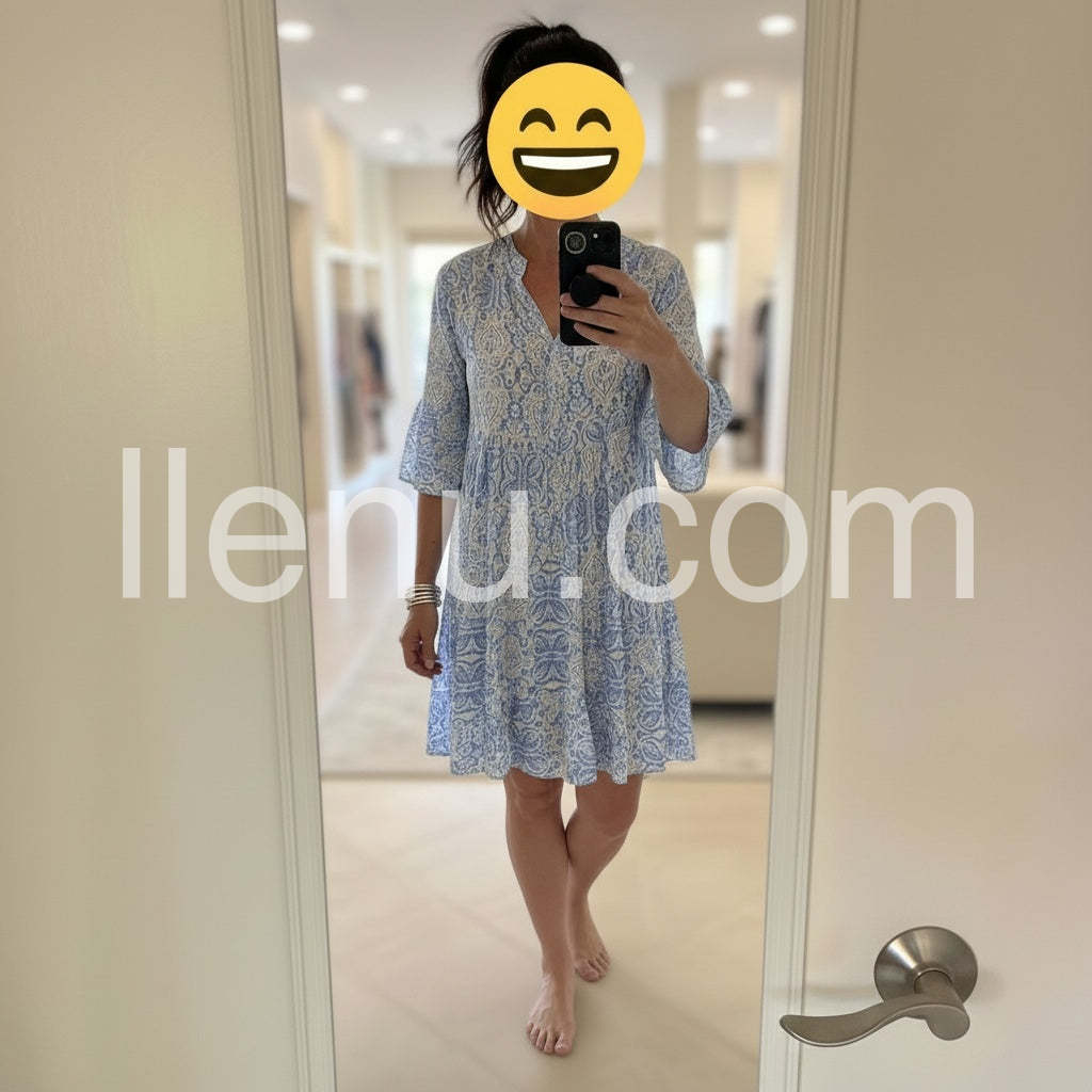 Weathered Blue White Vintage Print Half Sleeve Mini Dress