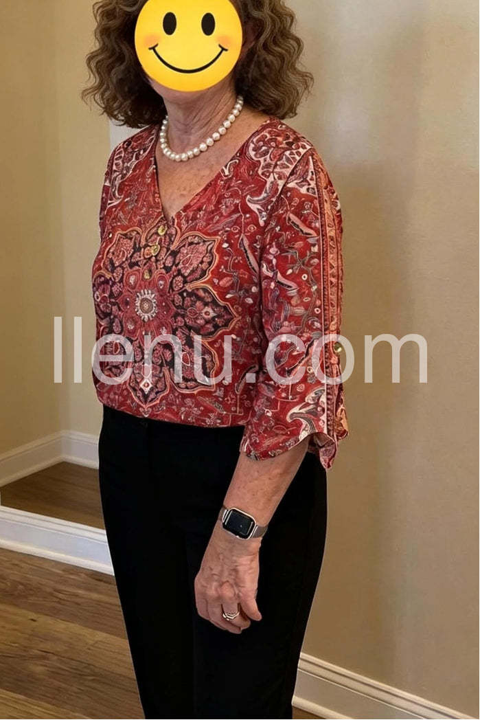 Yes!It runs true to the garment size chart please choose your size based on your measurements.A vibrant bohemian blouse featuring an intricate red paisley print. This elegant top showcases a classic V-neckline adorned with delicate buttons, adding a touch of sophistication. The three-quarter length flared sleeves create a flowy, feminine silhouette, perfect for both casual outings and more dressed-up occasions. Crafted from lightweight, breathable fabric, it ensures comfort all day long.