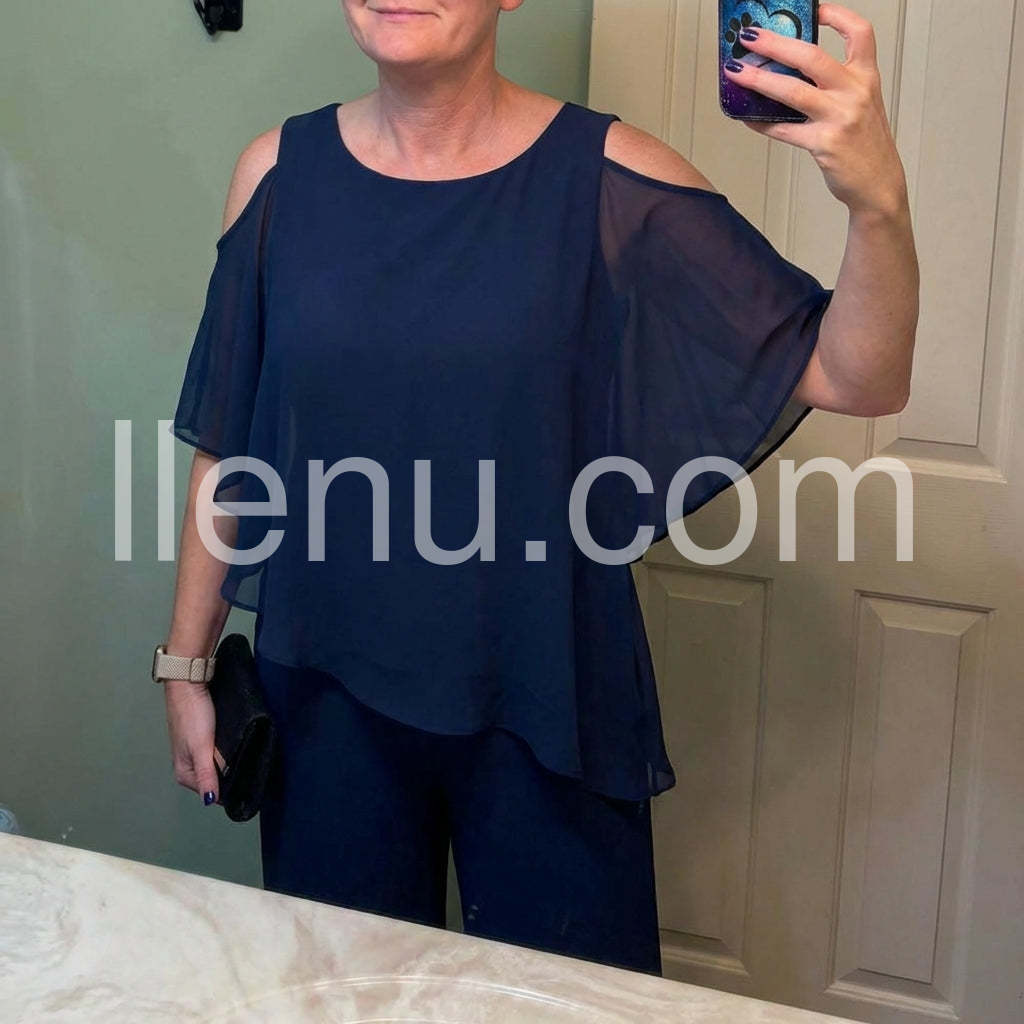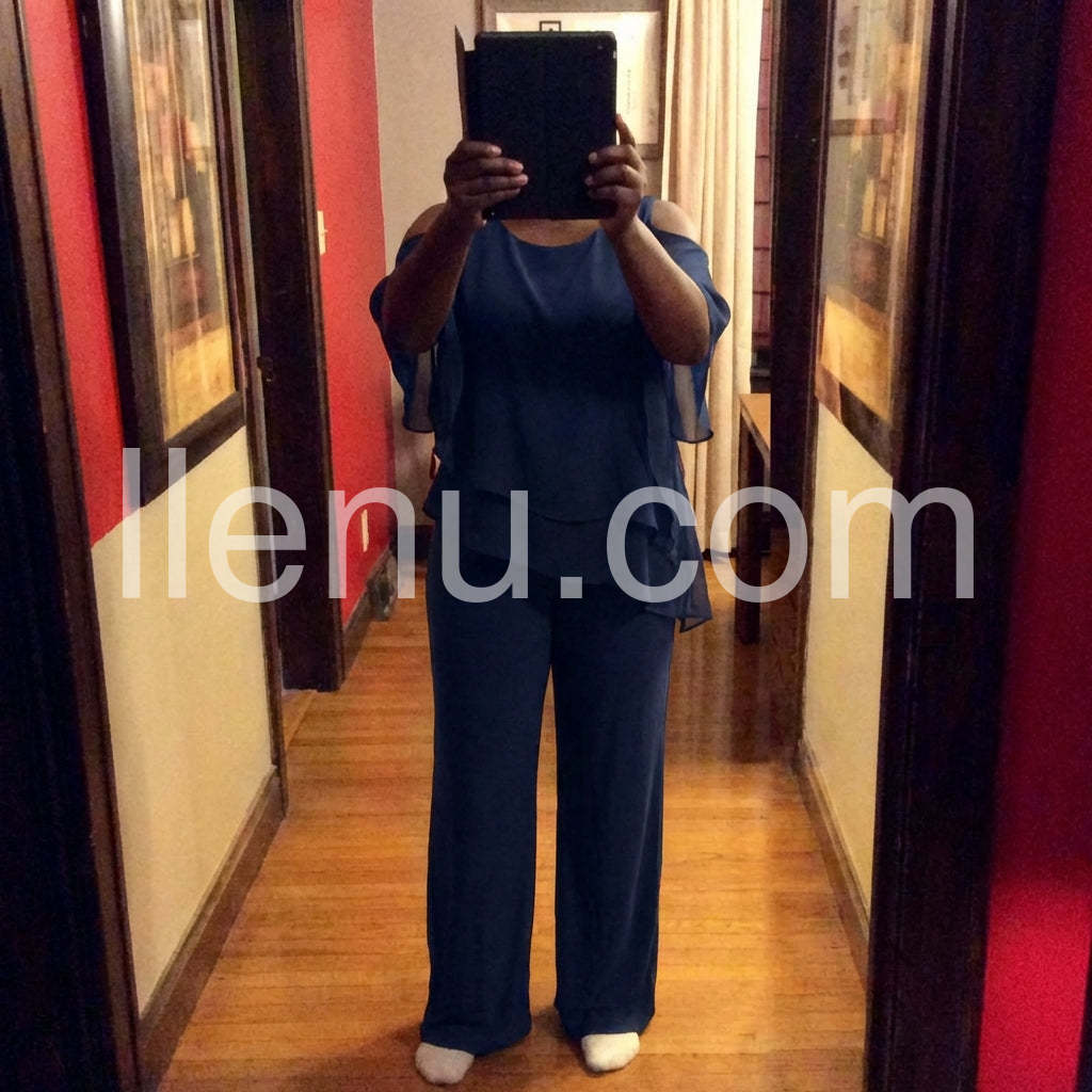 Yes!It runs true to the garment size chart please choose your size based on your measurements.This fashionable two-piece set includes a navy cold shoulder three-quarter length draped sleeves and asymmetrically layered ruffled top and pants. Crafted from lightweight and soft materials, this set is perfect for any occasion. Step up your look with this stylish set.
