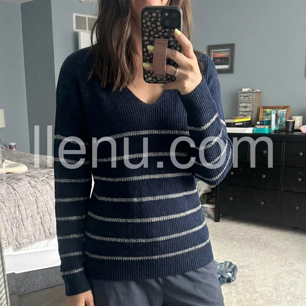 Yes!It runs true to the garment size chart please choose your size based on your measurements.Stay stylish and warm with our Groovy V-Neck Striped Print Navy Sweater. The v-neck adds a touch of elegance while the striped print adds a trendy flair. Made with high-quality materials, this sweater is perfect for any occasion. Upgrade your wardrobe and stay cozy this season.