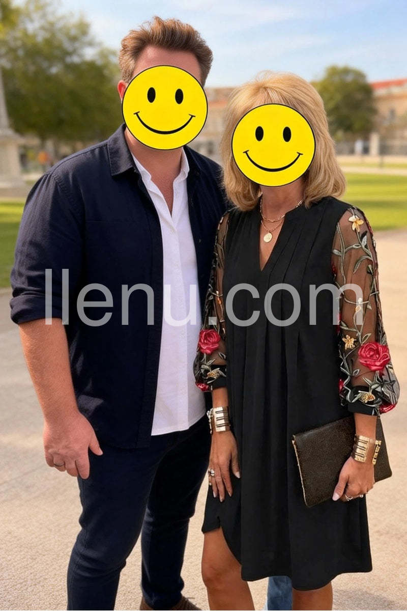 Yes!It runs true to the garment size chart please choose your size based on your measurements.Introducing our newest addition: Elegant V-Neck Sheer Sleeve Mini Dress. This dress features a flattering V-neckline and sheer sleeves for a touch of elegance. Made with high-quality materials and expert craftsmanship, this dress is perfect for any special occasion. Look and feel sophisticated with this must-have dress.