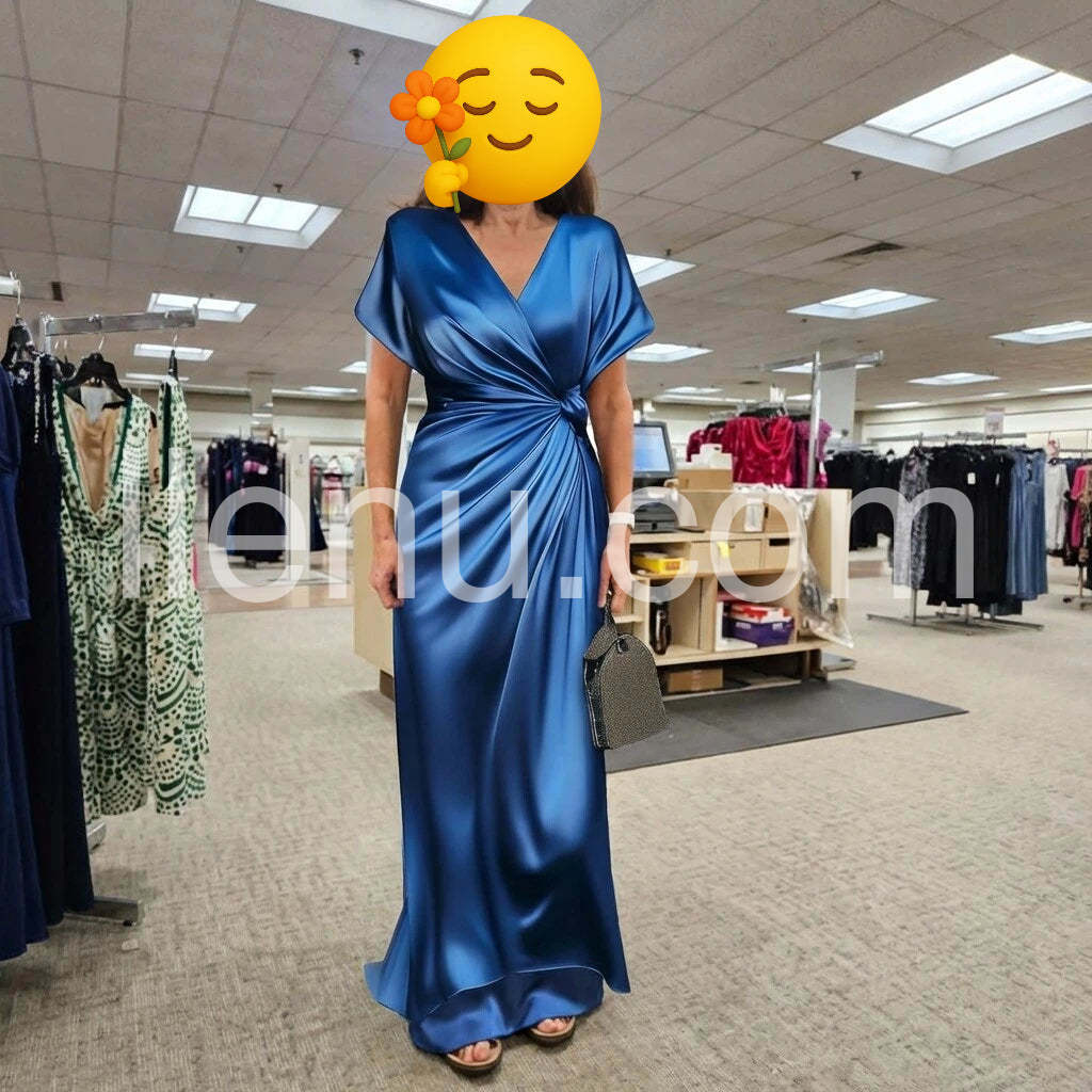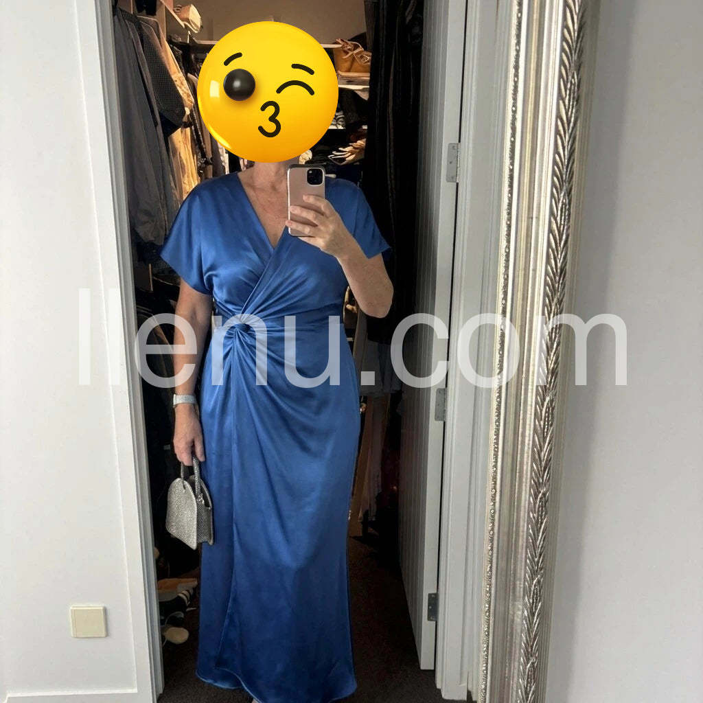 This blue satin maxi is stunning and perfect for online once you try it on at home. The wrap design with a waist knot creates a flattering silhouette, and the satin drapes beautifully. The color is rich and elegant, ideal for formal events or a classy evening out. Pairing with a small purse and simple sandals gives a polished, effortless vibe. True to size with good movement in the fabric. Smooth checkout and responsive customer support--highly recommended for a glam look you can wear online shopping with confidence.