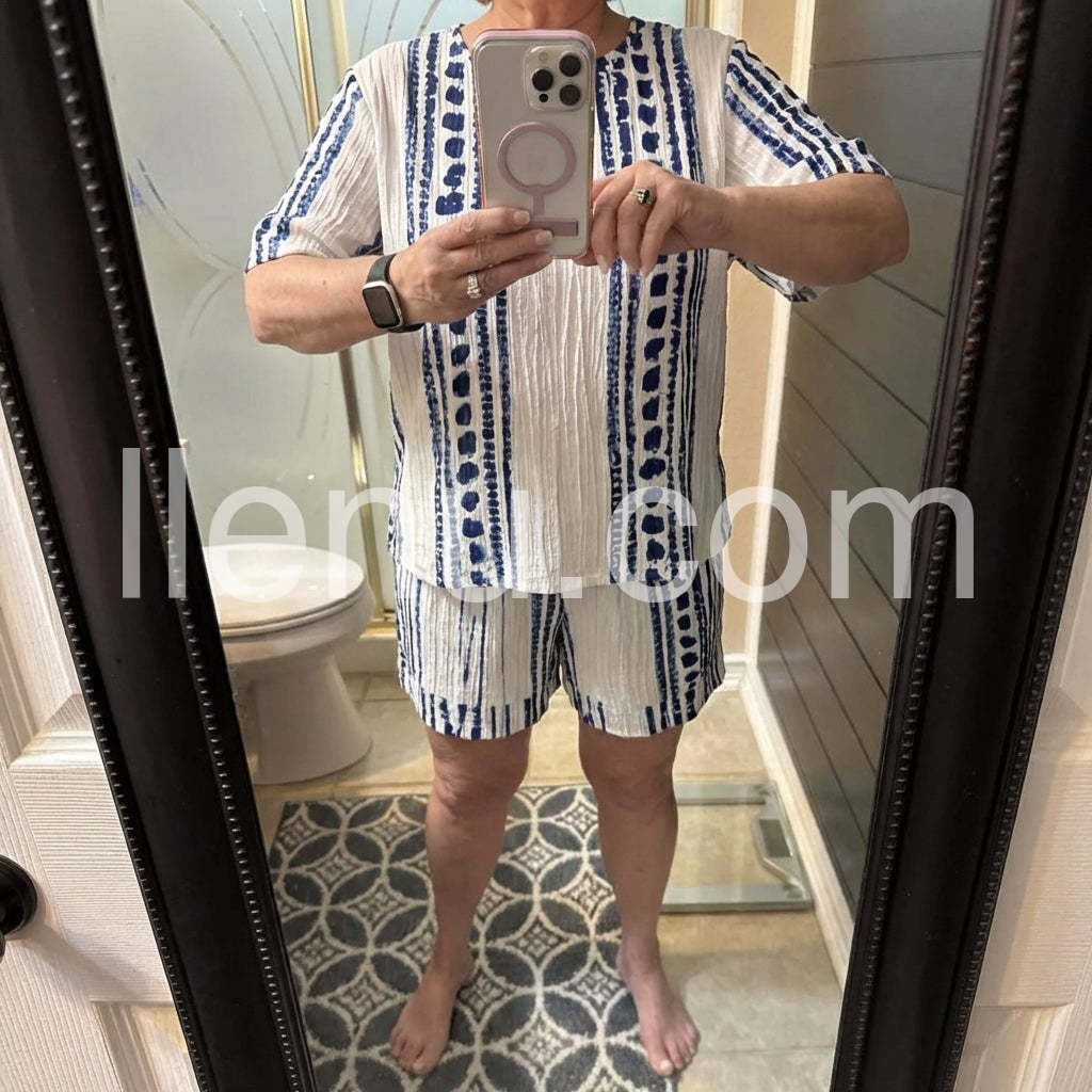 This matching set is absolutely delightful. The white and blue stripes look fresh and crisp, and the fabric feels light and breathableerfect for warm days. The fit is true to size, and the relaxed short silhouette is flattering and comfortable. The straw bag adds a perfect, tropical touch that ties the whole look together. Customer service was responsive, and delivery was quick, making the shopping experience smooth from start to finish. Highly recommend for a chic, effortless summer outfit.