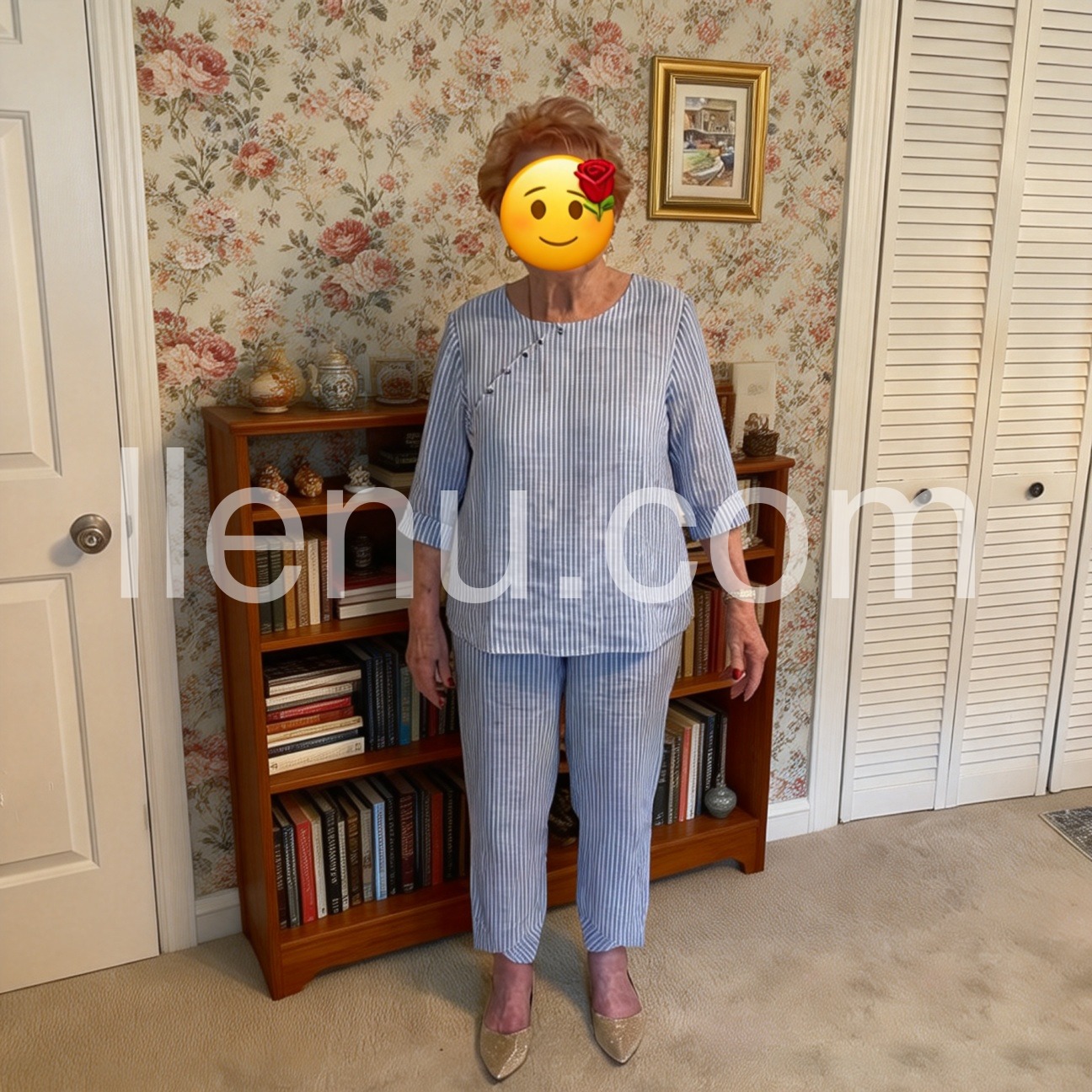 As a curvier woman, I appreciate how forgiving this set is. The top doesn't cling to my stomach, and the pants are roomy without looking baggy. Extremely happy with this purchase!
